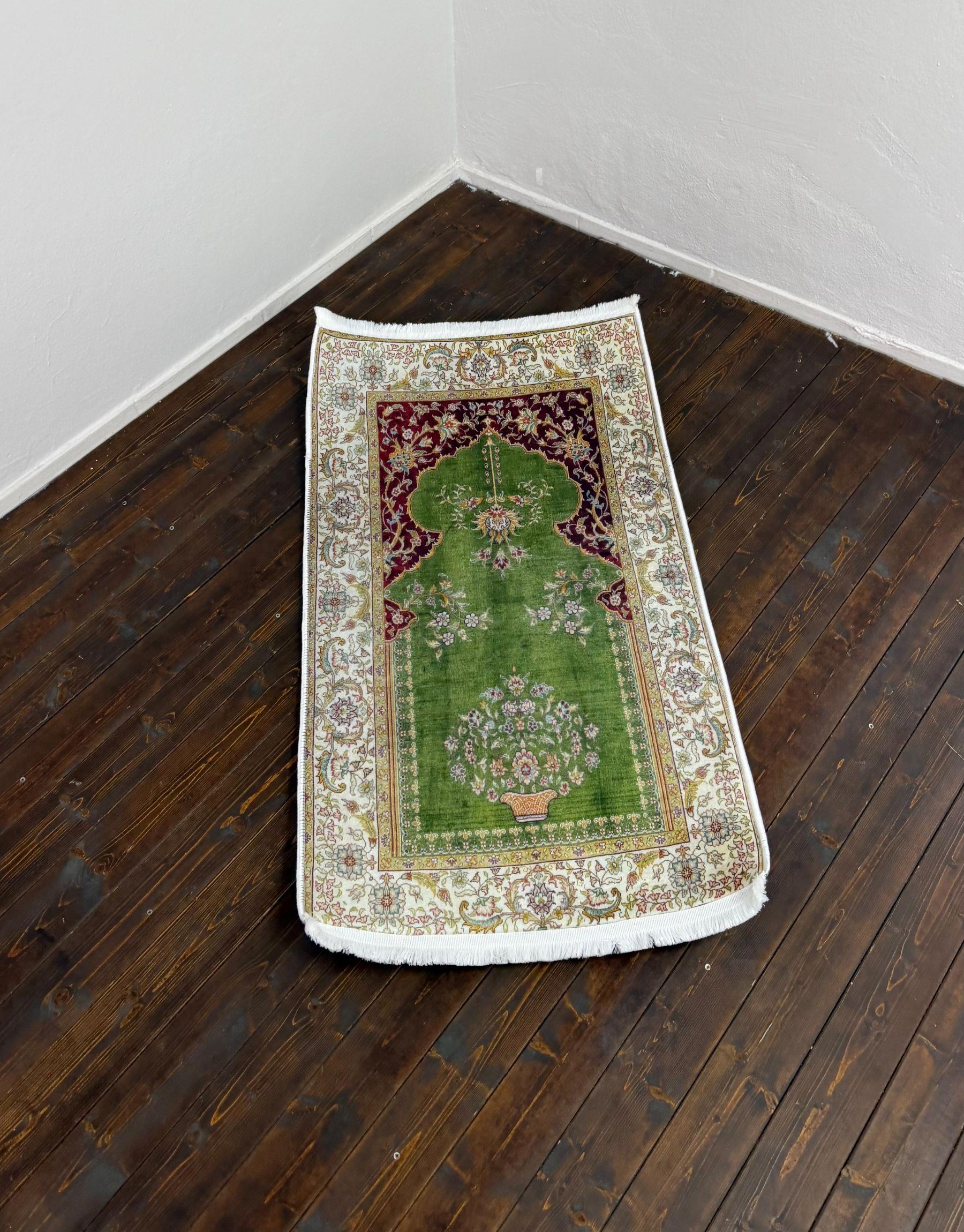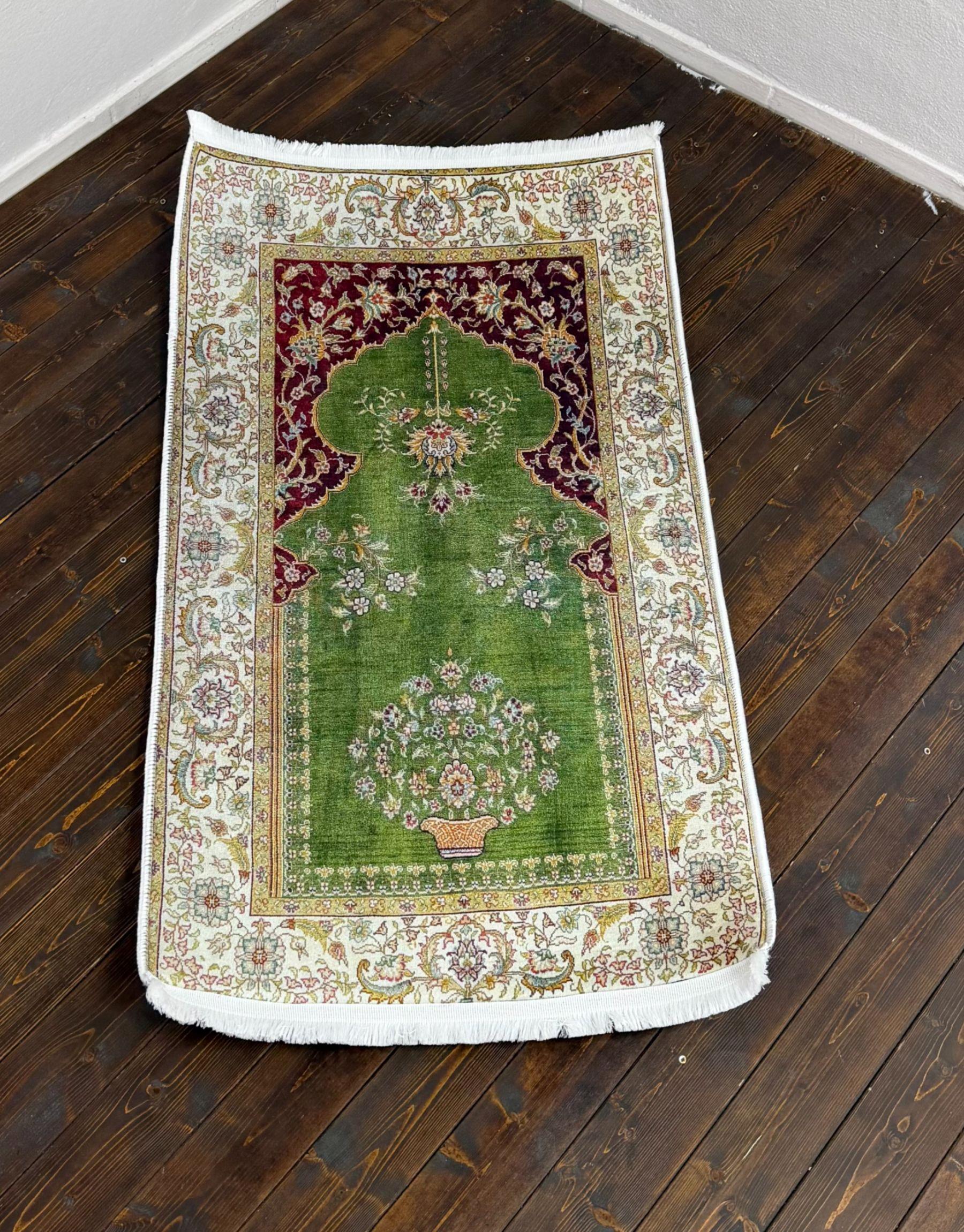Yeşil ve bej tonlarının yumuşak uyumu ile hazırlanan bu seccade, 1.5 cm ortopedik sünger ile dizlerinizi destekler, huzurlu bir kullanım sağlar.